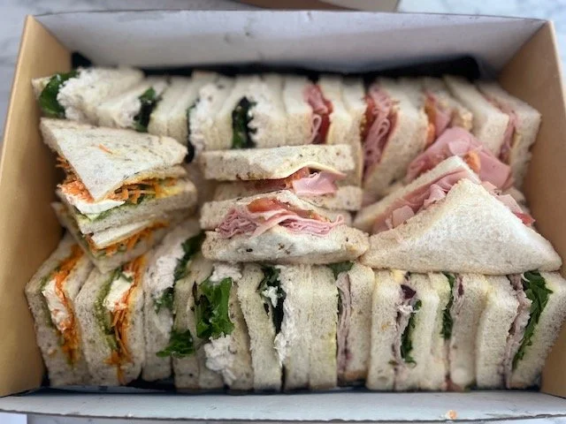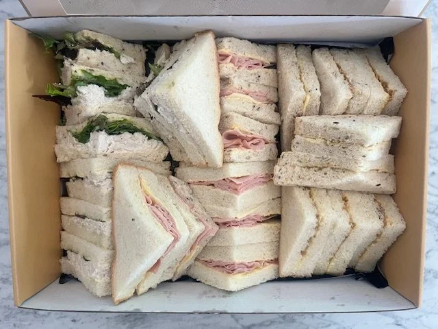 Mix of white/multigrain buttered bread. Ham/cheese, Chicken/mayo/lettuce, Turkey/Cranberry/Brie, Vegetarian/salad/cream cheese/pesto (contains nuts) No pesto available for nut free. GF available (on request)
