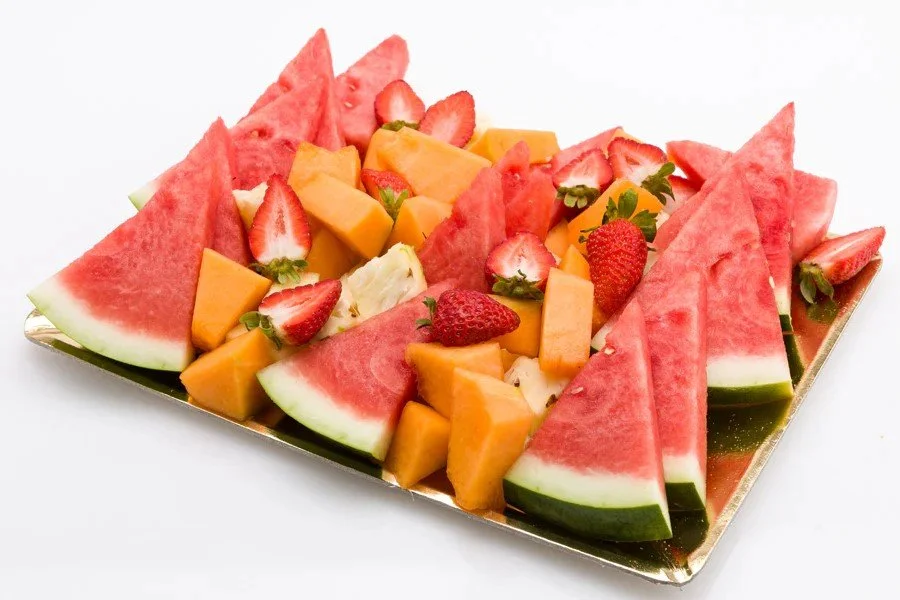 Seasonal fresh fruit. Usually, watermelon, rock melon, pineapple and strawberries. Serves 8-12