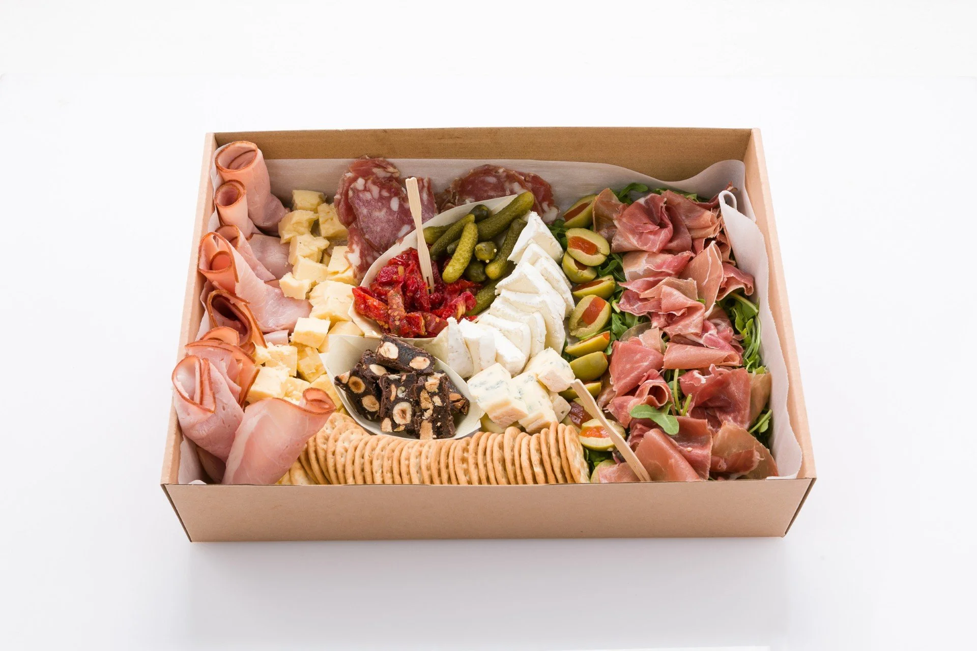 Packed with charcuterie deliciousness including prosciutto, ham, selection of cheeses, sundried tomatoes, pickles, chocolate, rocket and crackers. Yum!